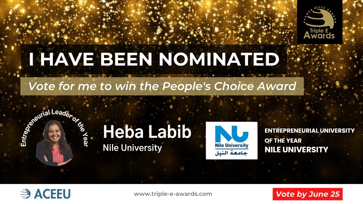 كما جاء ترشيح الدكتورة هبة لبيب المدير التنفيذي لمبادرة رواد النيل ومدير مركز الإبتكار وريادة الاعمال والتنافسية بجامعة النيل الأهلية لجائزة Triple E Awards””، ضمن فئة “Female Entrepreneurial Leader of the Year”، تقديرا لدورها في دعم مجالات ريادة الأعمال المختلفة في مصر على مدار سنواتن ويمكن التصويت للدكتورة هبيب لبيب من خلال هذا الرابط https://triple-e-awards.com/index/finalist/id/719.