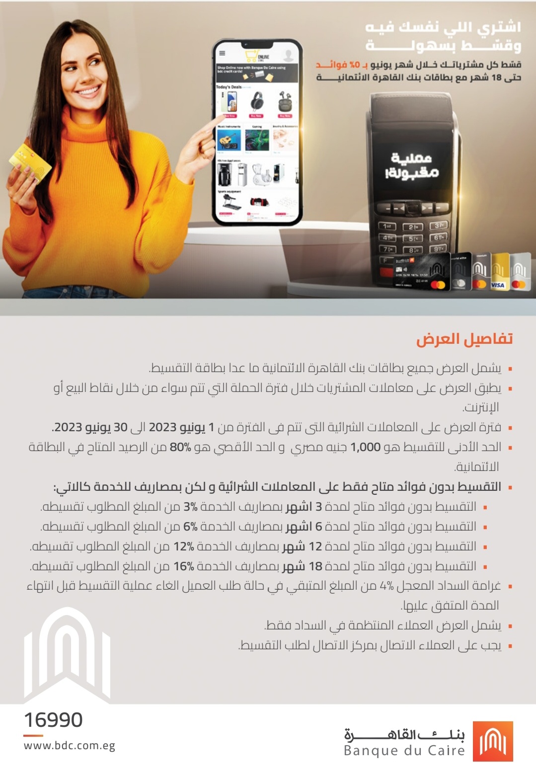 أعلن بنك القاهرة لعملائه عن إتاحة تقسيط مشترياتهم لمدة 18 شهر بدون فوائد في الفترة من 1 يونيو إلى 30 يونيو الجاري.