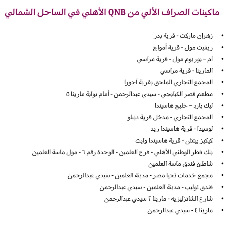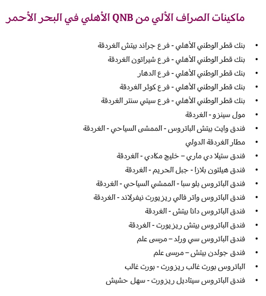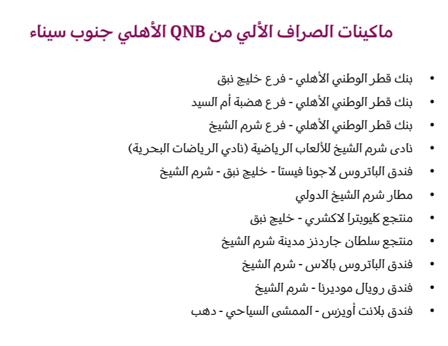 أعلن بنك QNB الأهلي عن أماكن تواجد ماكينات الصراف الآليATM في المدن السياحية ( البحر الأحمر- الساحل الشمالي- جنوب سيناء)والتي تتيح لعملائه سهولة الوصول لها ،والاستمتاع بعطلة عيد الأضحى.