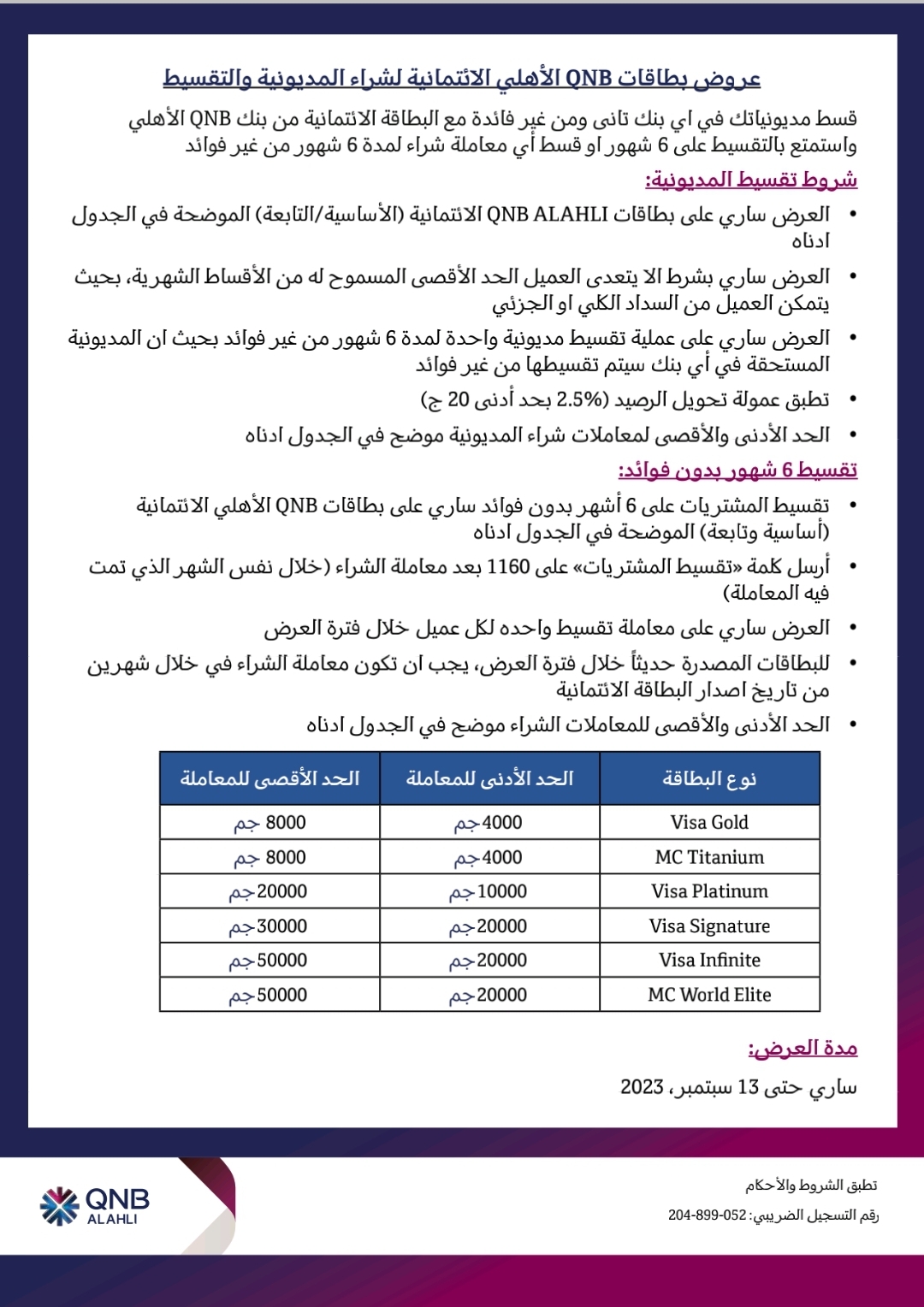 وذكر البنك على صفحته على موقع التواصل الإجتماعي ” فيسبوك” إنه مع بطاقات QNB الأهلي Visa الائتمانية يمكن لعملاء البنك تقسط صيانة السيارة أو قطع الغيار حتى 6 أشهر وبدون فوائد، وبدون مقدم أو مصاريف إدارية.