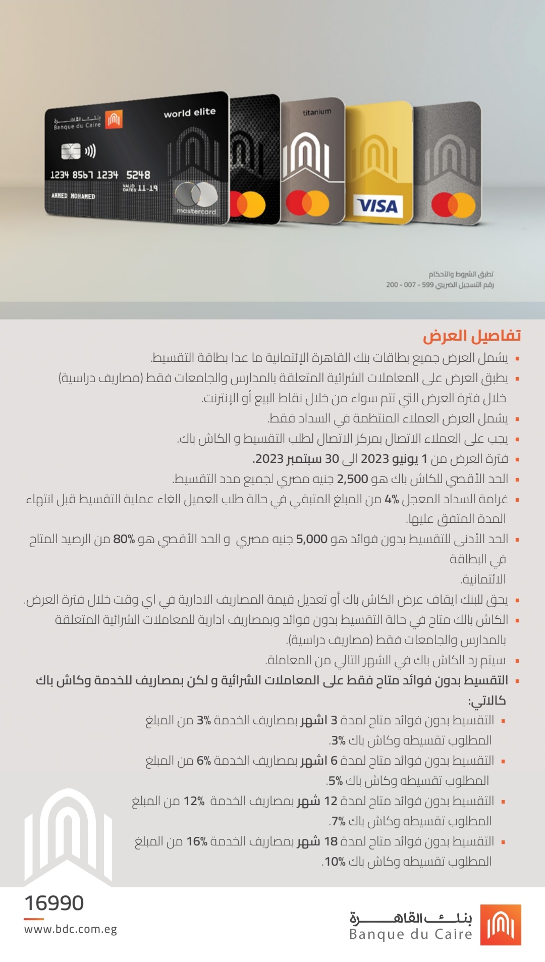 أعلن بنك القاهرة لعملائه عن إمكانية تقسيط مصاريف الدراسة حتى 18 شهرا بدون فوائد.