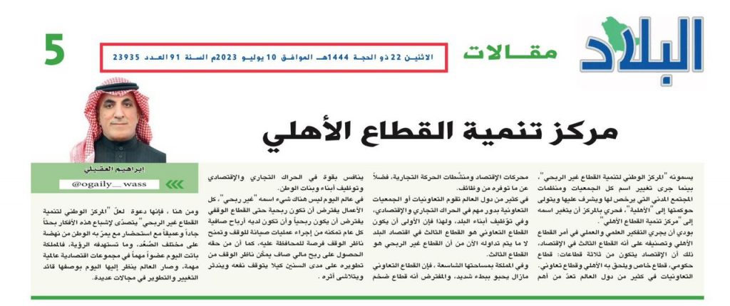 ومن هنا ، فإنها دعوة لعلّ “المركز الوطني لتنمية القطاع غير الربحي” يتصدّى لإشباع هذه الأفكار بحثاً جاداً وعميقاً مع استحضار مع يمرّ به الوطن من نهضة على مختلف الصُعُد، وما تستهدفه الرؤية، فالمملكة باتت اليوم عضواً مهماً في مجموعات اقتصادية عالمية مهمة، وصار العالم ينظر إليها اليوم بوصفها قائد التغيير والتطوير في مجالات عديدة.
