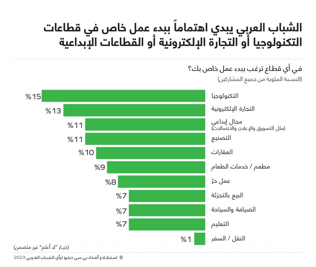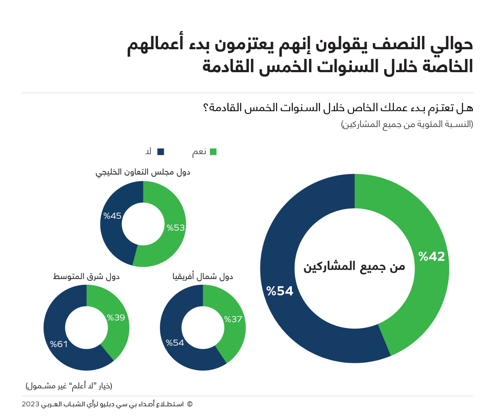 فيما يخص مستقبلهم المهني، كشفت نتائج الاستطلاع أن 42٪ من الشبان والشابات العرب يرغبون ببدء أعمالهم الخاصة خلال السنوات الخمس المقبلة. وبدت هذه الرغبة أكثر وضوحاً في دول مجلس التعاون الخليجي (53٪)، تليها دول شرق المتوسط (39٪) وشمال أفريقيا (37٪).
