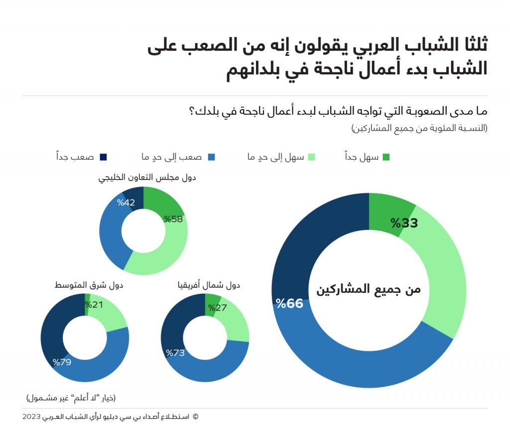 كما كان الشباب الخليجي أكثر تفاؤلاً بشأن بدء أعمالهم الخاصة، حيث قال 58٪ منهم أن بدء الأعمال في بلدانهم “سهل جداً/ سهل إلى حدٍ ما”، مقابل 79٪ من شباب دول شرق المتوسط و73٪ من شباب شمال أفريقيا قالوا إن الأمر “صعب جداً/ صعب إلى حد ما” في بلدانهم.