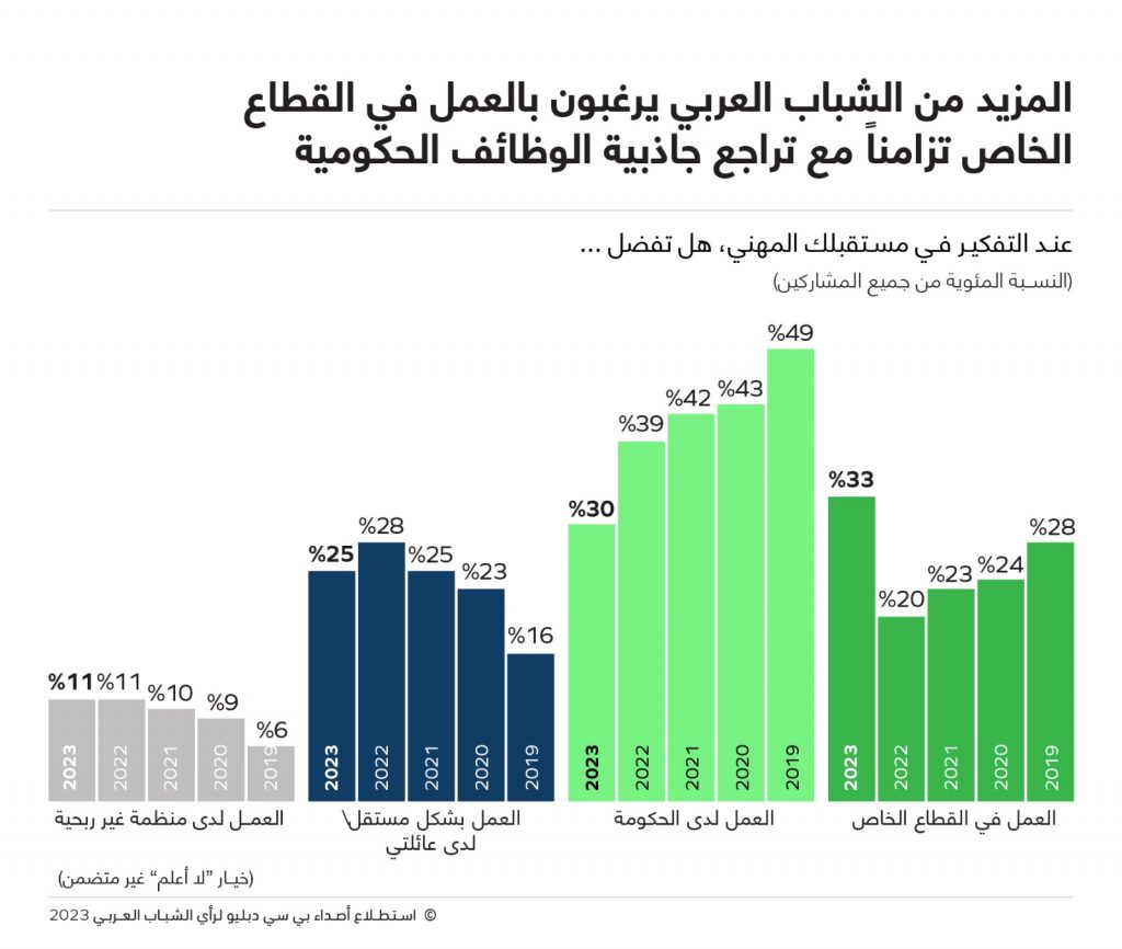 وكان حوالي نصف المشاركين في استطلاع عام 2019 قالوا إنهم يفضلون العمل في القطاع الحكومي مقابل أقل من الثلث (30٪) هذا العام. كما قال ثلث الشباب العربي (33٪) إنهم يفضلون بدء أعمالهم الخاصة، بزيادة قدرها 13% عن نتائج استطلاع عام 2022.
