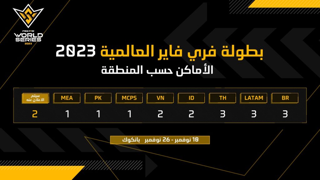 كشفت شركة جارينا عن التفاصيل الكاملة الخاصة ببطولة فري فاير العالمية (FFWS 2023) والتي ستُقام في نوفمبر المقبل بمدينة بانكوك التايلاندية، وسوف تتألف البطولة من مرحلتين – مرحلة المجموعات وستُقام مبارياتها على مدار 6 أيام من يوم 10 إلى 19 نوفمبر، ومرحلة النهائيات الكبرى من يوم 24 إلى 26 نوفمبر.
