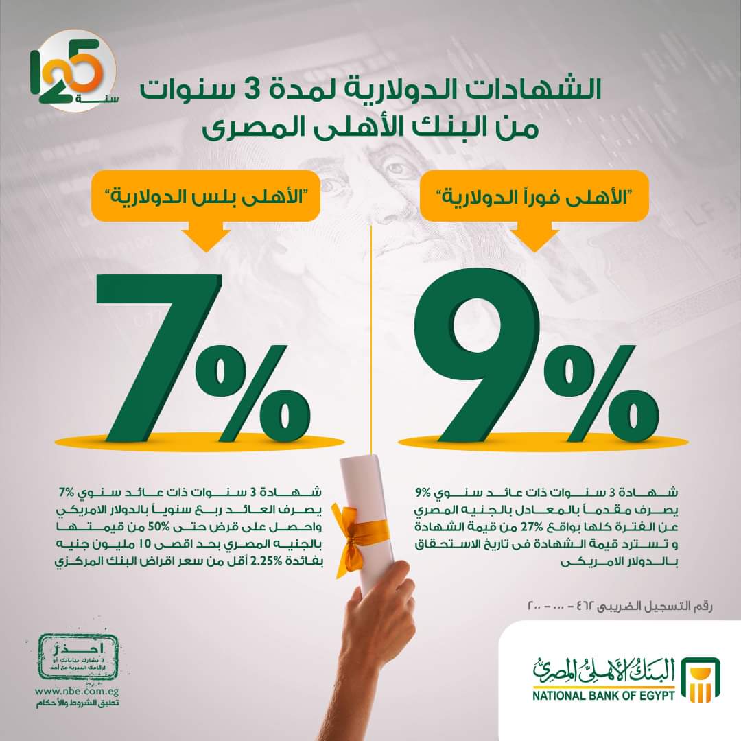 الشهادة الدولارية الأولى ” الأهلي بلس” وتبلغ مدة الشهادة ٣ سنوات بسعر عائد سنوي 7٪ ويصرف العائد بذات العملة ربع سنويا، كما يجوز الاقتراض بضمانها حتى 50% من قيمتها بالمعادل للجنيه المصري وذلك بحد أقصى يصل الى 10 مليون جنيه وتطبيق سعر اقراض البنك المركزي وقت المنح مخصوم منه 2.25%