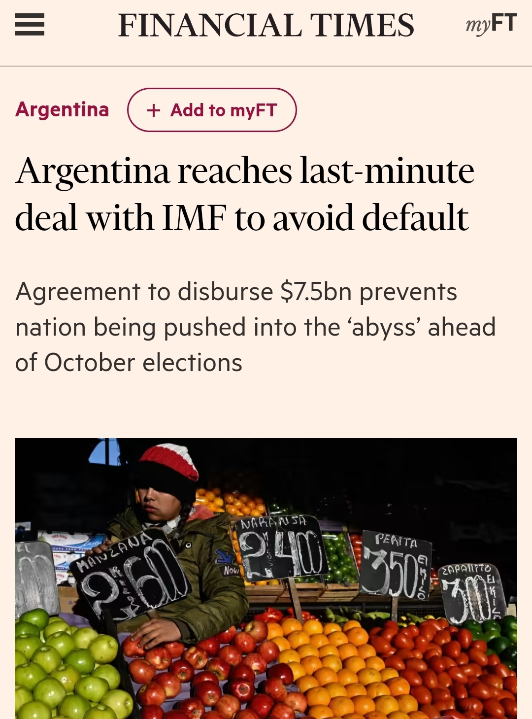ذكرت صحيفة فاينانشيال تايمز في تقرير لها أن دقائق كانت تفصل دولة الأرجنتين عن إعلان إفلاسها وعدم قدرتها عن سداد ديونها لولا تدخل صندوق النقد الدولي وعقد إتفاق طارئ مع الأرجنتين لصرف 7.5 مليار دولار بشكل عاجل.