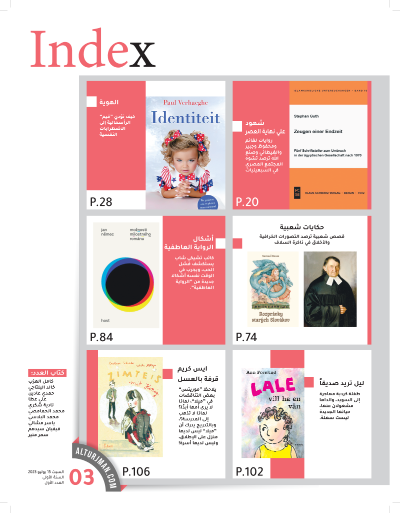 ومن أبرز عروض العدد الأول كتاب “شهود على نهاية عصر ..تحول المجتمع المصري بعد 1970” للألماني شيفان جوت، والذي يتناول ظاهرة اجتماعية –أدبية تشكلت بداياتها في سبعينيات القرن الماضي، وتبلورت أدبيا في ثمانيناته تقريبا، وذلك من خلال روايات لكل من نجيب محفوظ، وفتحي عانم، وصنع الله إبراهيم، وجمال الغيطاني، وعبده حبير، ويرى المترجم أنها تنطوي على ما يمكن اعتباره البدايات الأولي لتحول في مسار المجتمع المصري، نبتت بذرته في سبعينيات القرن الماضي وازدراد عمقا وتشعبا عبر العقود الأربعة التالية لنرى نتائجة في مزيد من تحلل القيم الإيجابية للجماعة الإنسانية المصرية لصالح قيم فردية سلبية، والروايات التي تعرض المؤلف لها بالتحليل هي “قليل من الحب ..كثير من العنف” لفتحي غانم، و”الحب فوق هضبة الهرم” و”أهل القمة” لنجيب محفوظ، و”تحريك القلب” لعبده جبير، و”رسالة البصائر في المصائر” لجمال الغيطاني، و”اللجنة “لصنع الله إبراهيم.
