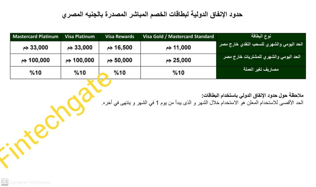 وذكر البنك في رسالة بعث بها إلى عملاءه مصحوبة برابط بالتعديلات الجديدة، أن حدود الإنفاق الدولية للبطاقات الإئتمانية المصدرة بالجنيه، أصبحت كالتالي:
