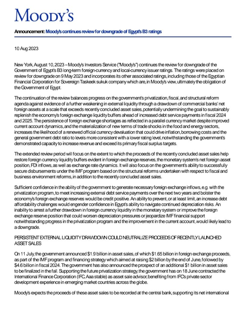 أصدرت مؤسسة موديز للتصنيف الائتماني تقريرا عن مصر قالت فيه أنها سترجئ إصدار تصنيفها للاقتصاد المصري لبعض الوقت مع إحتمالية خفضه.