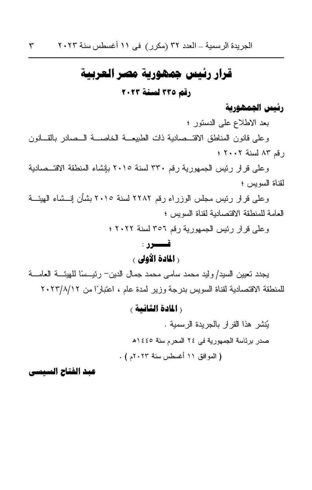 أصدر الرئيس عبدالفتاح السيسي رئيس الجمهورية قراراً جمهورياً رقم 335 لسنة 2023، بتجديد تعيين وليد جمال الدين رئيساً للهيئة العامة للمنطقة الاقتصادية لقناة السويس لمدة عام، اعتباراً من 12 أغسطس 2023.