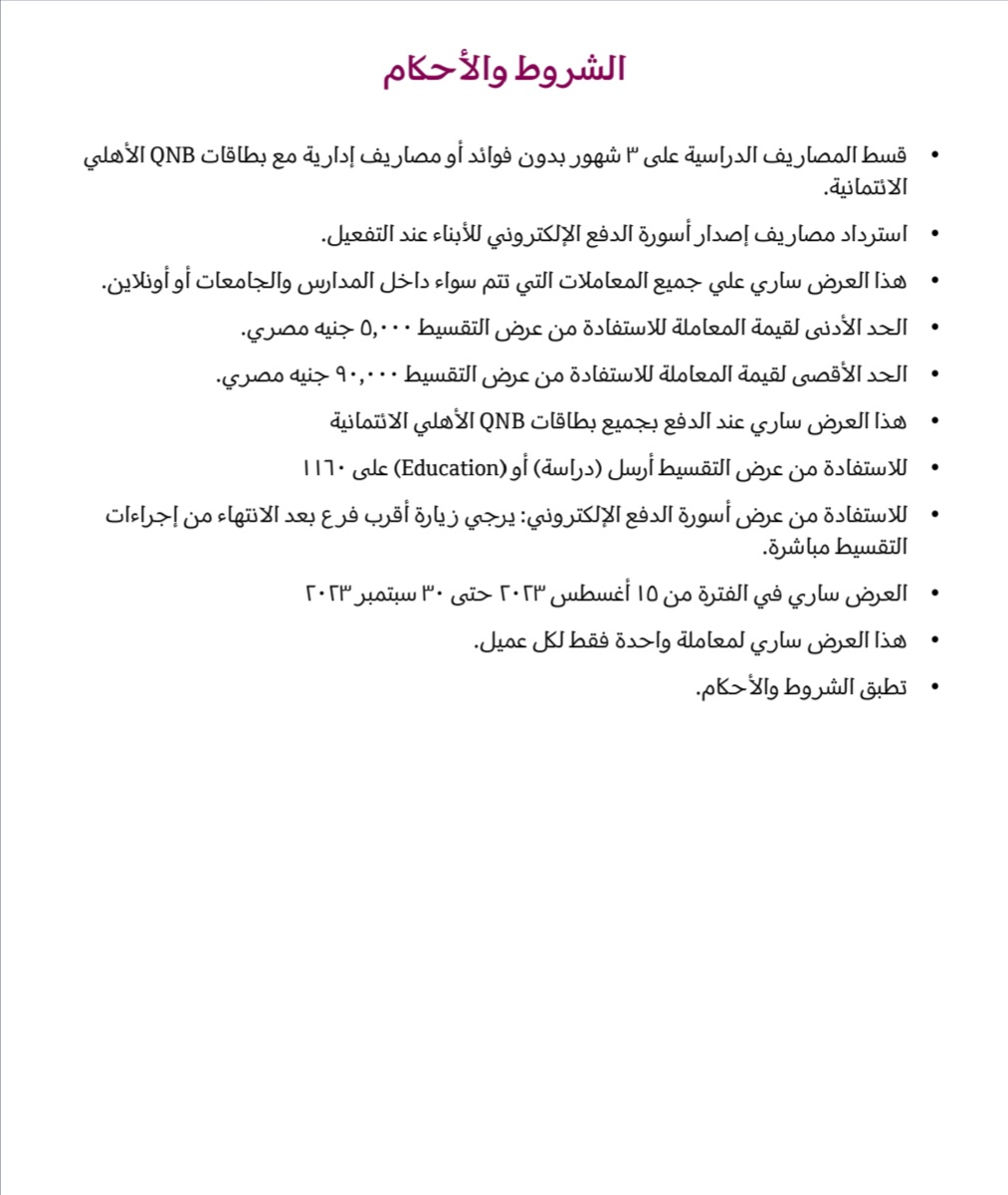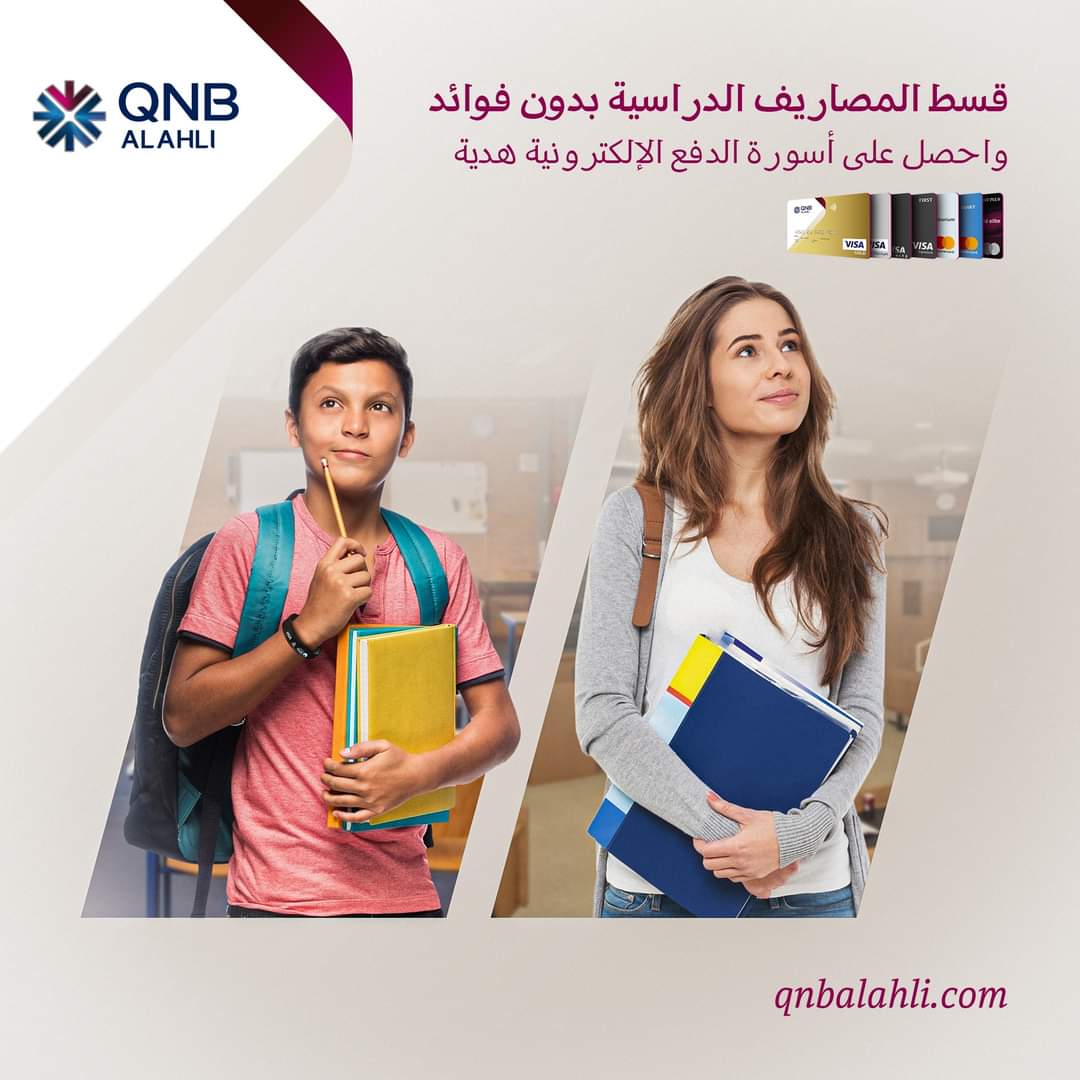 أعلن بنك QNB الأهلي لعملائه إتاحة تقسيط المصاريف الدراسية على3 شهور بدون فوائد أو مصاريف إدارية عند الدفع بجميع بطاقات QNB الأهلي الائتمانية التقسيط مباشرة.