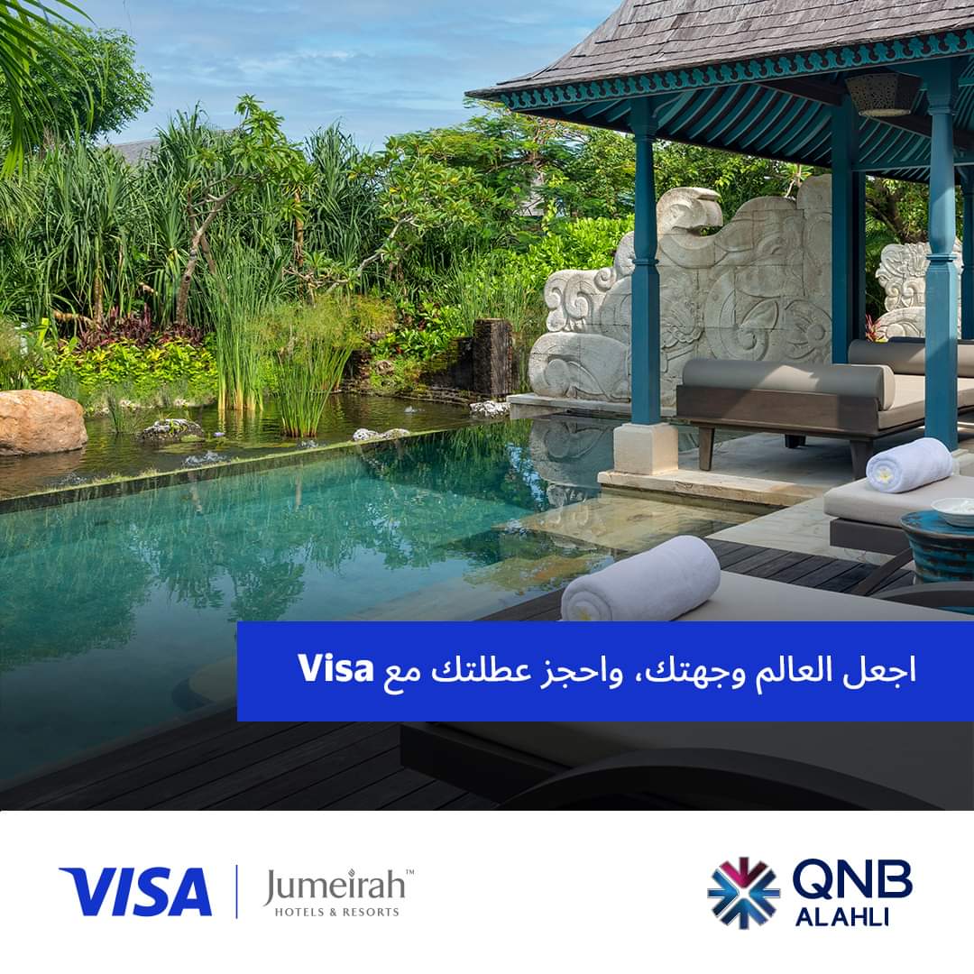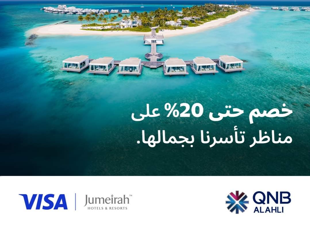 أعلن بنك QNB الأهلي لعملائه إمكانية الحصول على خصم يصل إلى 20% عند استخدام بطاقات VISA من QNB الأهلي على الغرف والأجنحة في فنادق ومنتجعات جميرا في 9 دول هي، الإمارات العربية المتحدة وجزر المالديف وبالي والمملكة المتحدة وإسبانيا والكويت وعمان والبحرين والصين.