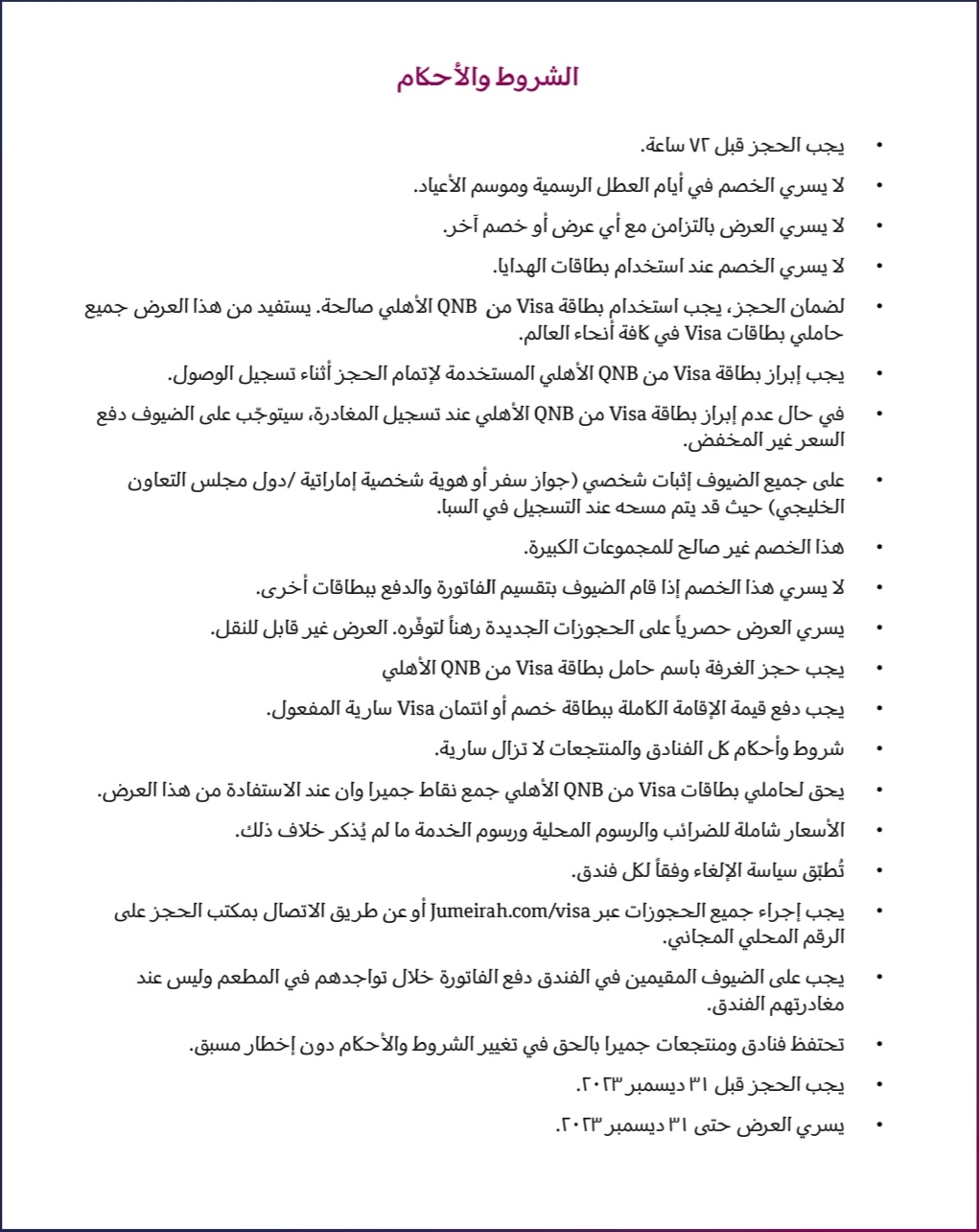 وأضاف يحق لحاملي بطاقات Visa من QNB الأهلي جمع نقاط جميرا وان عند الاستفادة من هذا العرض،و الأسعار شاملة للضرائب والرسوم المحلية ورسوم الخدمة ما لم يُذكر خلاف ذلك.