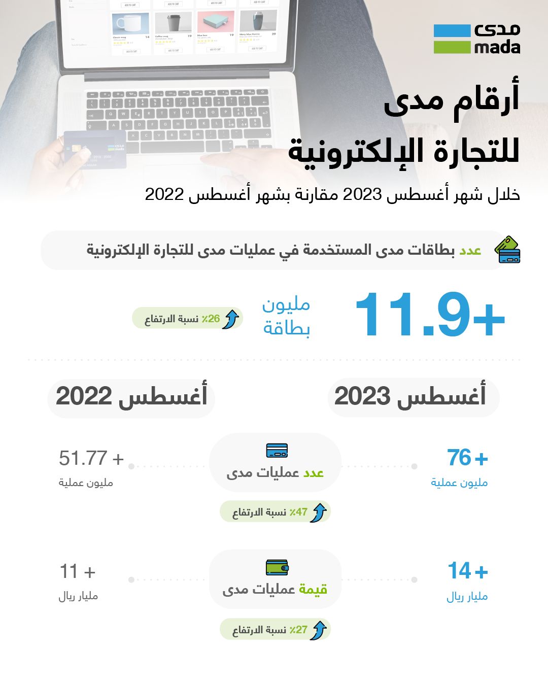 أعلنت شبكة مدى السعودية عن إحصاءات عمليات التجارة الإلكترونية لشهر أغسطس الماضي، حيث بلغ عدد البطاقات المستخدمة في عمليات التجارية الإلكترونية بالمملكة خلال شهر أغسطس من العام الحالي 11.9 مليون بطاقة، تم من خلالها 76 مليون عملية مقارنة مع 51.7 مليون عملية في اغسطس 2022 بنمو نسبته 47%.