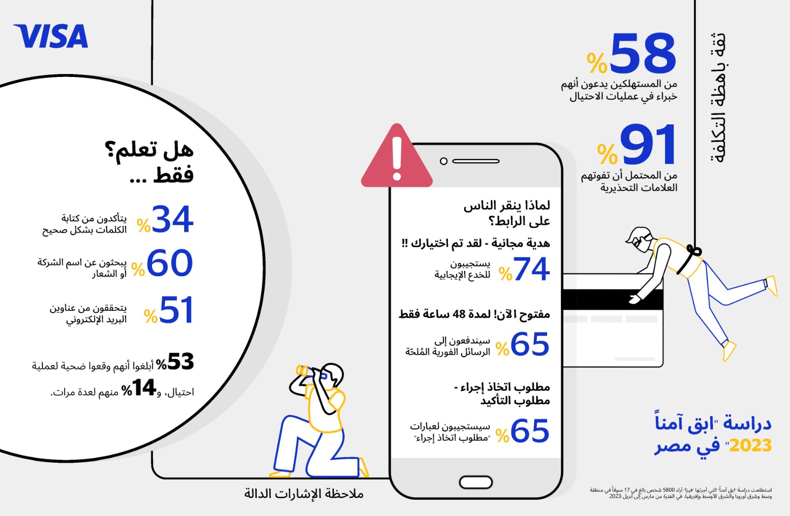 وتوصلت دراسة فيزا “ابق آمنًا” لعام٢٠٢٣ إلى أن أكثر من نصف الأشخاص في مصر قد كانوا ضحايا لعملية احتيال لمرة واحدة على الأقل 5%مقارنة بالمعدل العالمي البالغ 52% .