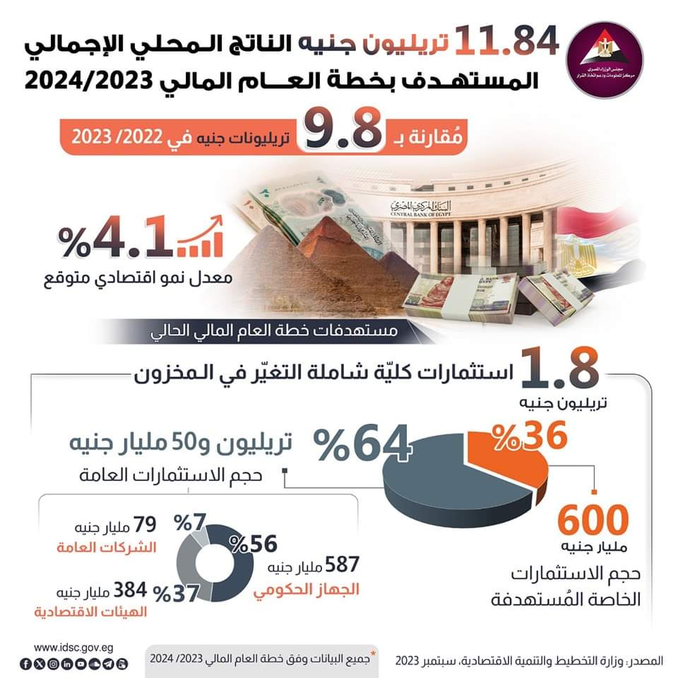 ذكر مركز المعلومات ودعم اتخاذ القرار التابع لمجلس الوزراء المصري أن حجم الناتج المحلي الإجمالي المتوقع بنهاية العام المالي الحالي 2023 – 2024 من المرجح أن يصل إلى 11.84 تريليون جنيه مقارنة مع 9.8 تريليون جنيه في العام المالي الماضي.
