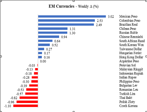 ارتفعت عملات الأسواق الناشئة على الرغم من وصول الدولار إلى أعلى مستوى له منذ بداية العام حتى الآن، حيث صعد مؤشر مورجان ستانلي لعملات الأسواق الناشئة MSCI EM بنسبة 0.66%، محققًا أعلى مكسب أسبوعي له في شهرين، وذلك بقيادة عملات أمريكا اللاتينية، حيث أدت البيانات الإيجابية الصادرة حول الاقتصاد الصيني إلى تعزيز أسعار السلع الأساسية (تمثل الصادرات الرئيسية لدول أمريكا اللاتينية). وحقق مؤشر مورجان ستانلي لعملات الأسواق الناشئة مكاسب خلال كل جلسة من جلسات التداول هذا الأسبوع، باستثناء جلسة يوم الجمعة، مع تراجع قطاع العقارات الصيني بشكل مفاجئ.