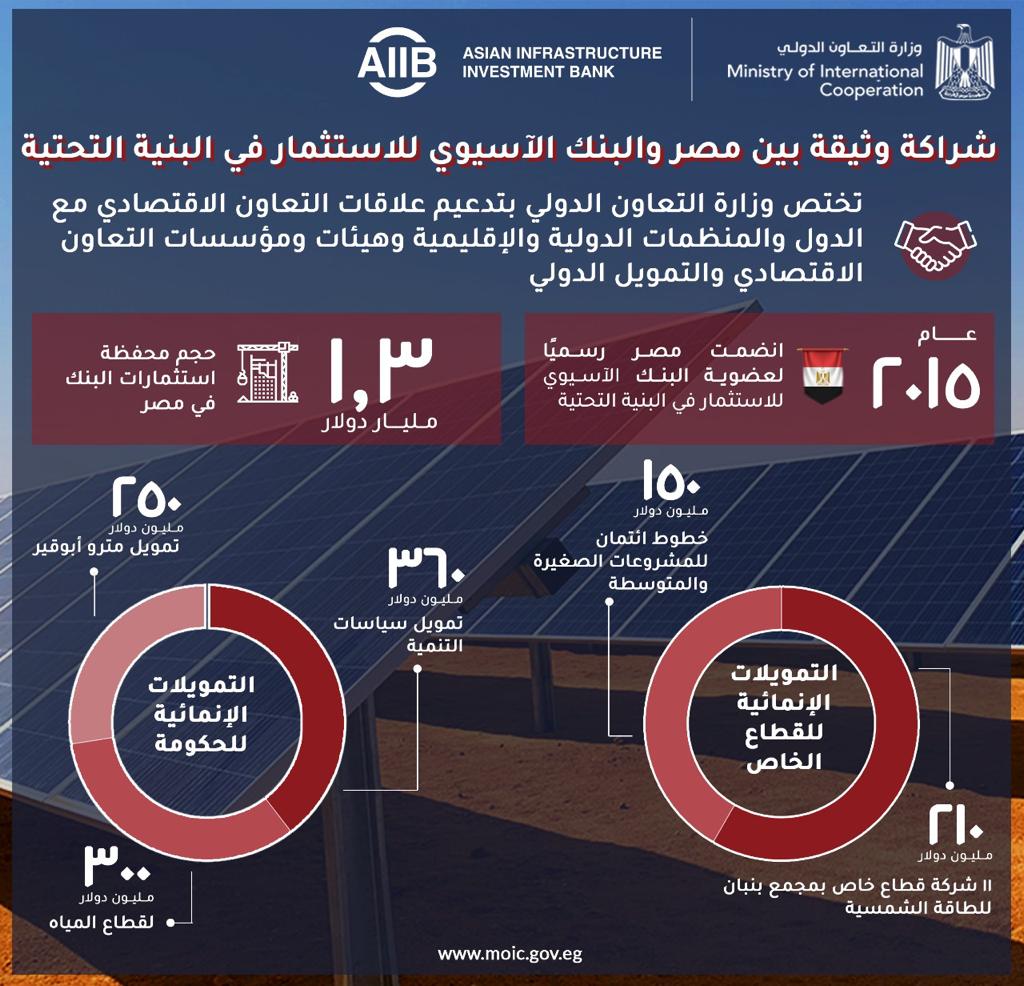 تزامنًا مع انطلاق الاجتماعات السنوية للبنك الآسيوي للاستثمار في البنية التحتية بمدينة شرم الشيخ، تحت رعاية السيد الرئيس عبدالفتاح السيسي، تستعرض وزارة التعاون الدولي تفاصيل محفظة التعاون الإنمائي الجارية مع البنك منذ انضمام مصر رسميًا لعضويته عام 2016، حيث يعد أحد بنوك التنمية الدولية متعددة الأطراف المتخصصة في التمويل والاستثمار في مشروعات البنية التحية المستدامة وتحفيز الاستثمارات الخضراء والذكية التي تعزز الاتصال الإقليمي.