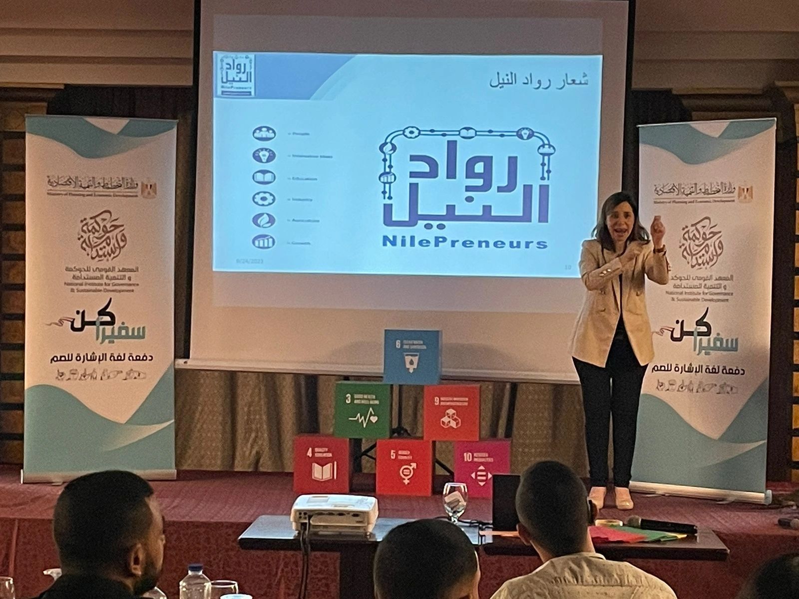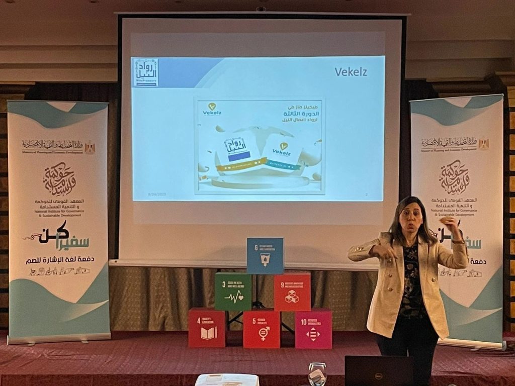 دعاء عصمت تقدم محاضرة بلغة الإشارة للتوعية بمبادرة رواد النيل بالمعهد القومي للحوكمة