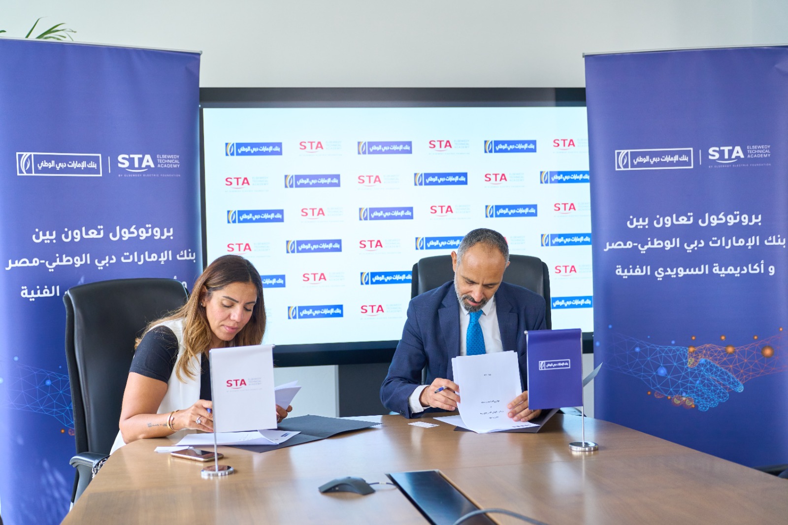 وقع بروتوكول التعاون من جانب بنك الإمارات دبي الوطني – مصر، د. أمجد دومه، رئيس قطاع الاستراتيجيات والاستدامة في البنك، ومن جانب الأكاديمية ، الأستاذة/حنان الريحاني، الرئيس التنفيذي لأكاديمية السويدي الفنية STA.