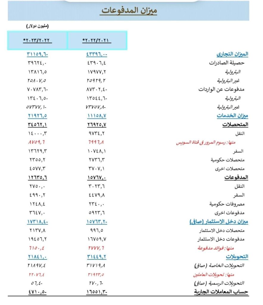 وإرتفع العجز في ميزان دخل الاستثمار بمعدل 9.9% ليسجل نحو 17.3 مليار دولار في العام المالي الماضي 2022- 2023 مقابل نحو 15.8 مليار دولار، نتيجة إرتفاع مدفوعات دخل الاستثمار بنحو 2.7 مليار دولار لتسجل نحو 19.5 مليار دولار مقابل نحو 16.8 مليار دولار انعكاساً لزيادة الفوائد المدفوعة عن الدين الخارجي.