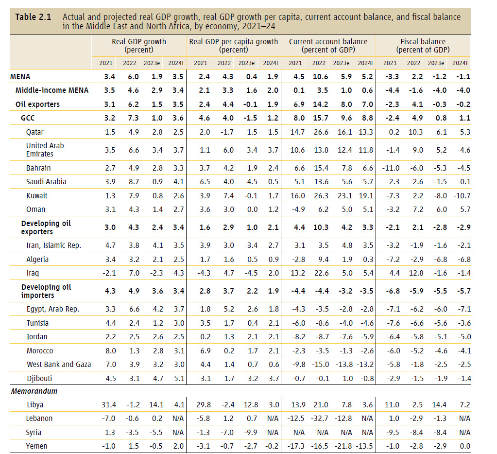 وقدر تقرير البنك الدولي أن تنمو اقتصادات الدول المستوردة للنفط بنسبة 3.6% في 2023 و3.4% في 2024، حيث من المتوقع نمو اقتصاد جمهورية مصر العربية بنسبة 4.2% بنهاية العام الجاري، وتونس بنسبة 1.2% والأردن 2.6% والمغرب 2.8%.