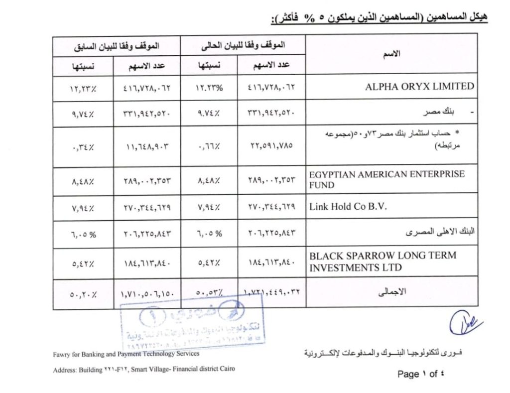 وأظهر إفصاح الشركة، أن هيكل كبار المساهمين، ضم كل من ألفا أوريكس ليمتد بنسبة 12.2% وبنك مصر ومجموعاته المرتبطة 10.4% وصندوق انتربرايز المصري الأمريكي 8.48% ولينك هولد كو بي في 7.9% والبنك الأهلي المصري 6.05% وبلاك سبارو لونج تيرم انفستمنتس ليمتد 5.4%.