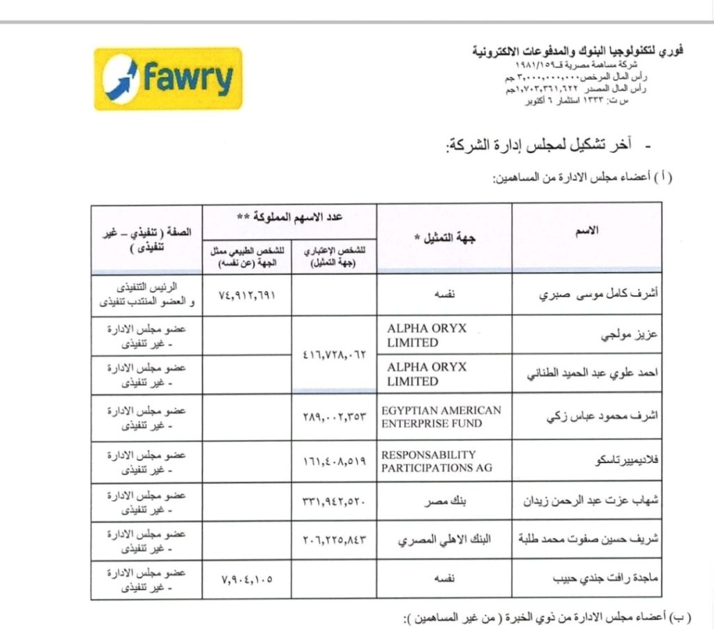كشفت شركة «فوري لتكنولوجيا البنوك والمدفوعات الإلكترونية» عن قيام الرئيس التنفيذي والعضو المنتدب للشركة أشرف صبري بزيادة حصته في أسهم الشركة خلال الفترة الماضية إلى 2.2 % من إجمالي أسهم رأس المال.