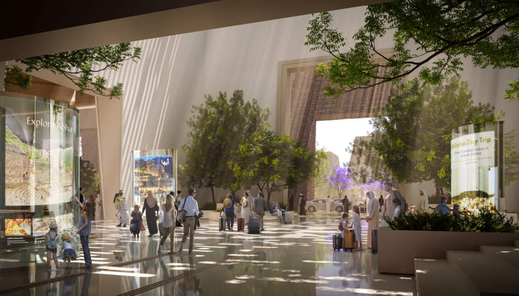 ويهدف مطار أبها الجديد الذي سيتم بناؤه بهوية معمارية متسقة مع تراث منطقة عسير؛ ليصبح معلماً بارزاً من المعالم المميزة بالمملكة، حيث ستصل مساحة صالته إلـى 65 ألف متر مربع مقارنة بـنحو 10 آلاف وخمسمائة متر مربع للمطار الحالي، إضافة إلى إنشاء جسـور إركاب، وإنشاء منصات جديدة وخدمات ذاتية لإنهاء وتسهيل إجراءات السفر، وبناء مواقف سيارات بطاقة استيعابية عالية، حيث من المخطط الانتهاء من المرحلة الأولى بحلول عام 2028م.