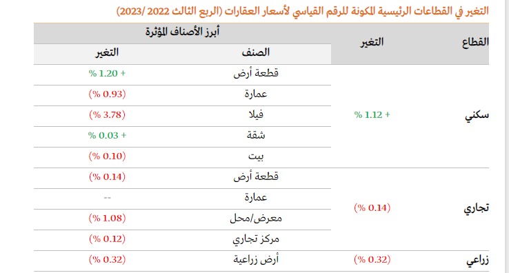 وقالت الهيئة إن ارتفاع الأراضي السكنية هو المؤثر الأكبر في ارتفاع أسعار العقارات في الربع الثالث 2023.
