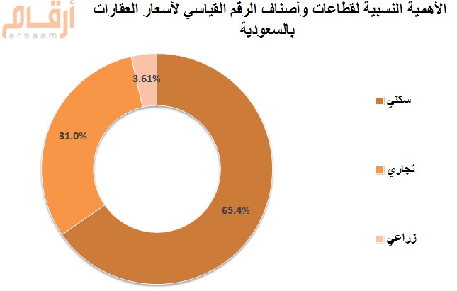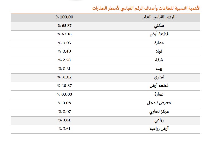 وفيما يلي جدول يبين الأهمية النسبية لقطاعات وأصناف الرقم القياسي لأسعار العقارات: