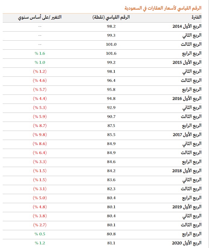 وكانت هيئة الإحصاء قد حددت عام 2014 كسنة أساس (100 نقطة) لاحتساب الرقم القياسي لأسعار العقارات في السعودية، والجدول التالي يوضح التغير في الرقم القياسي لأسعار العقارات في السعودية: