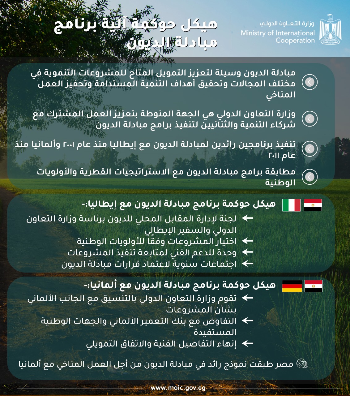 في التقرير التالي تستعرض وزارة التعاون الدولي، المعلومات الكاملة عن برامج مبادلة الديون مع شركاء التنمية الثنائيين، وهيكل الحوكمة في البرامج المطبقة مع الشركاء، وآليات تنفيذ تلك البرامج، والريادة المصرية في تنفيذ برنامج مبادلة الديون من أجل العمل المناخي، ودور الوزارة المنوط بها لإدارة تلك البرامج بالتنسيق مع شركاء التنمية والجهات الوطنية.