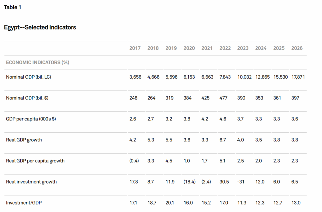 Due to the foreign currency crunch, we expect GDP growth to slow further in fiscal 2024. However, after the CBE’s long-term strategy for the exchange rate becomes clearer, market confidence should improve. We project growth to pick up over our forecast horizon to fiscal 2026. The construction and energy sectors could be key drivers of growth, along with IT and communications, wholesale and retail trade, agriculture, and health care. The Hayah Karima program, which aims to improve living standards in rural communities, should help develop the quality of infrastructure.