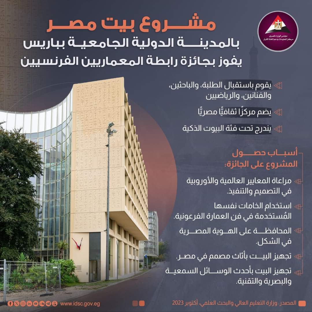 وأوضح الإنفوجراف ان مشروع بيت مصر بالمدينة الدولية الجامعية بباريس يفوز بجائزة رابطة المعماريين الفرنسيين، والذي يعد بمثابة المشروع القومي الوحيد خارج حدود جمهورية مصر العربية .
