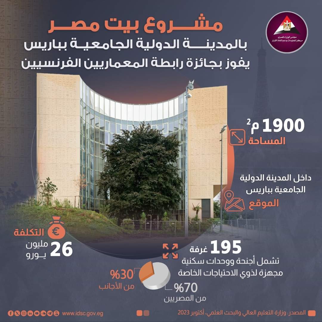 وأوضح الإنفوجراف ان مشروع بيت مصر بالمدينة الدولية الجامعية بباريس يفوز بجائزة رابطة المعماريين الفرنسيين، والذي يعد بمثابة المشروع القومي الوحيد خارج حدود جمهورية مصر العربية .