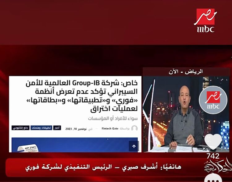 استعان الإعلامي الكبير عمرو أديب في برنامجه على قناة إم بي سي مصر MBC مصر بالإنفراد الخاص ببوابة التكنولوجيا المالية Fintechgate حول التقرير الذي أعدته شركة Group-IB حول نتائج فحصها لأنظمة وتطبيقات وبطاقات شركة فوري لتكنولوجيا البنوك والمدفوعات الإلكترونية والذي أكد عدم تعرض الشركة أو أنظمتها أو تطبيقاتها وبطاقاتها لأية أعمال قرصنة أو هجوم سيبراني أو اختراق.