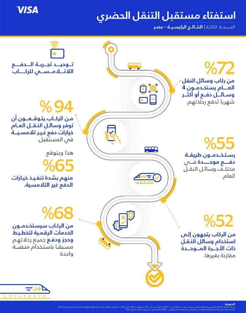 وبين الاستطلاع أنه في الوقت الحالي يستخدم 72٪ من الركاب في مصر أربع طرق للدفع أو أكثر لدفع أجرة المواصلات، وحيث أعرب 52٪ من المشاركين في الاستطلاع عن نيتهم زيادة استخدام وسائل النقل العام في الأشهر الـ 12 المقبلة، تصبح عوامل السرعة والأمان وسهولة استخدام نظام موحد للدفع أمرًا بالغ الأهمية لتوفير تجربة تنقل سلسة. وتكشف النتائج أيضًا أنه مع وجود طريقة دفع واحدة تغطي جميع نفقات التنقل، من المرجح أن يجرب 55٪ من المشاركين في الاستطلاع أشكالًا مختلفة من وسائل النقل العام. والأهم من ذلك، يشعر 68٪ من المشاركين في الاستطلاع أن ذلك سيمكنهم من التخطيط لرحلاتهم وحجزها والدفع مسبقًا لجميع وسائل النقل من خلال منصة واحدة.