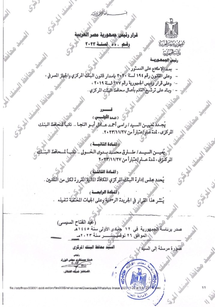 كما تضمن القرار تعيين طارق الخولي نائبا لمحافظ البنك المركزي لمدة عام وذلك بناء على مستند متداول: