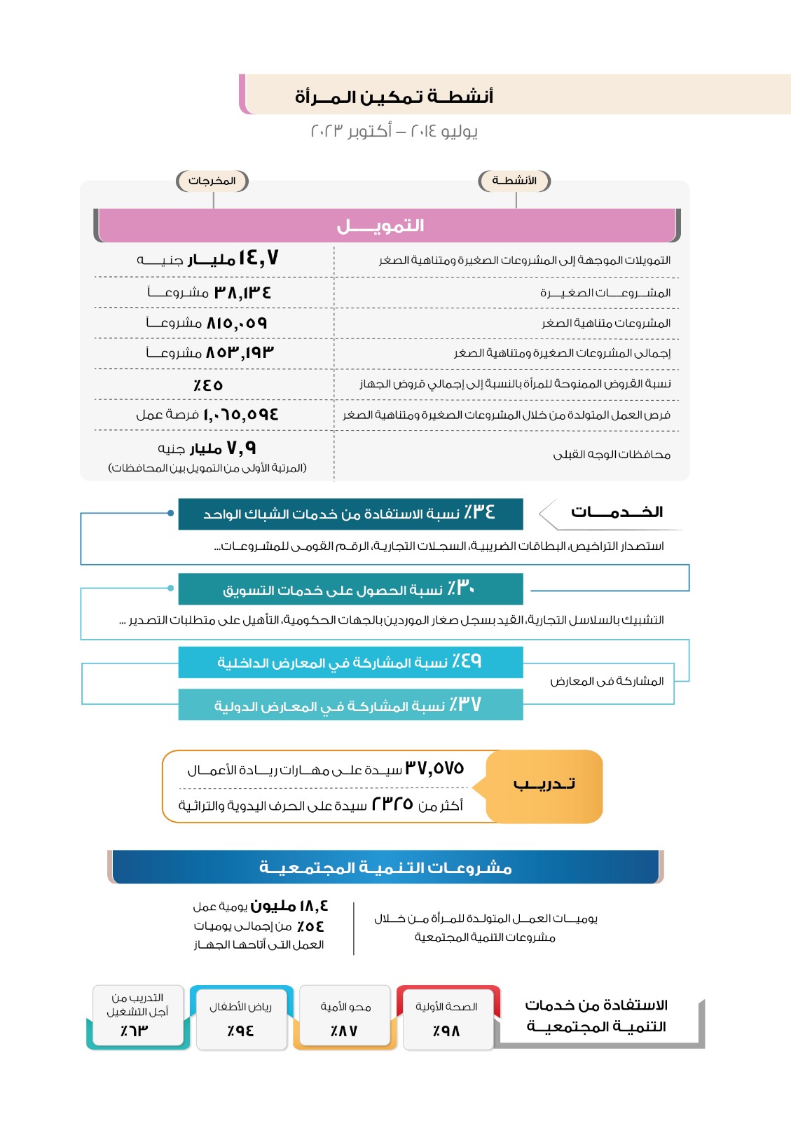 “يساهم الجهاز في تنفيذ عدد من المبادرات الهادفة لتمكين المرأة المصرية اقتصاديا حيث يقوم بتنفيذ برامج للتدريب والتأهيل لتشجيع المرأة على إقامة مشروعات صغيرة ومتناهية الصغر بالإضافة إلى تمويل هذه المشروعات وتقديم الاستشارات والدعم الفني والتسويقي لمساعدتها على الاستمرار في مشروعاتها والتوسع فيها. ”