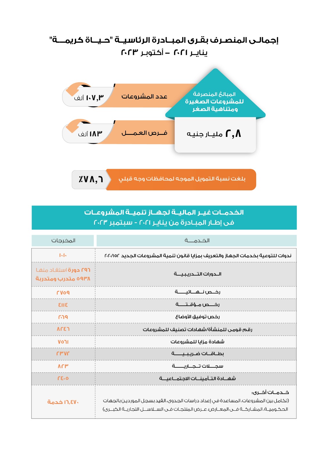 وأوضح باسل رحمي الرئيس التنفيذي للجهاز أن أداء جهاز تنمية المشروعات المتوسطة والصغيرة ومتناهية الصغر قد تضاعف منذ تولي  الرئيس المسئولية موضحا أن الجهاز قام بضخ تمويلات قدرها 48.3 مليار جنيه في الفترة من يوليو 2014 وحتى أكتوبر 2023 تم خلالها تمويل 1.9 مليون مشروع صغير ومتناهي وفرت وحافظت على استمرارية ما يزيد على 3 ملايين فرصة عمل.