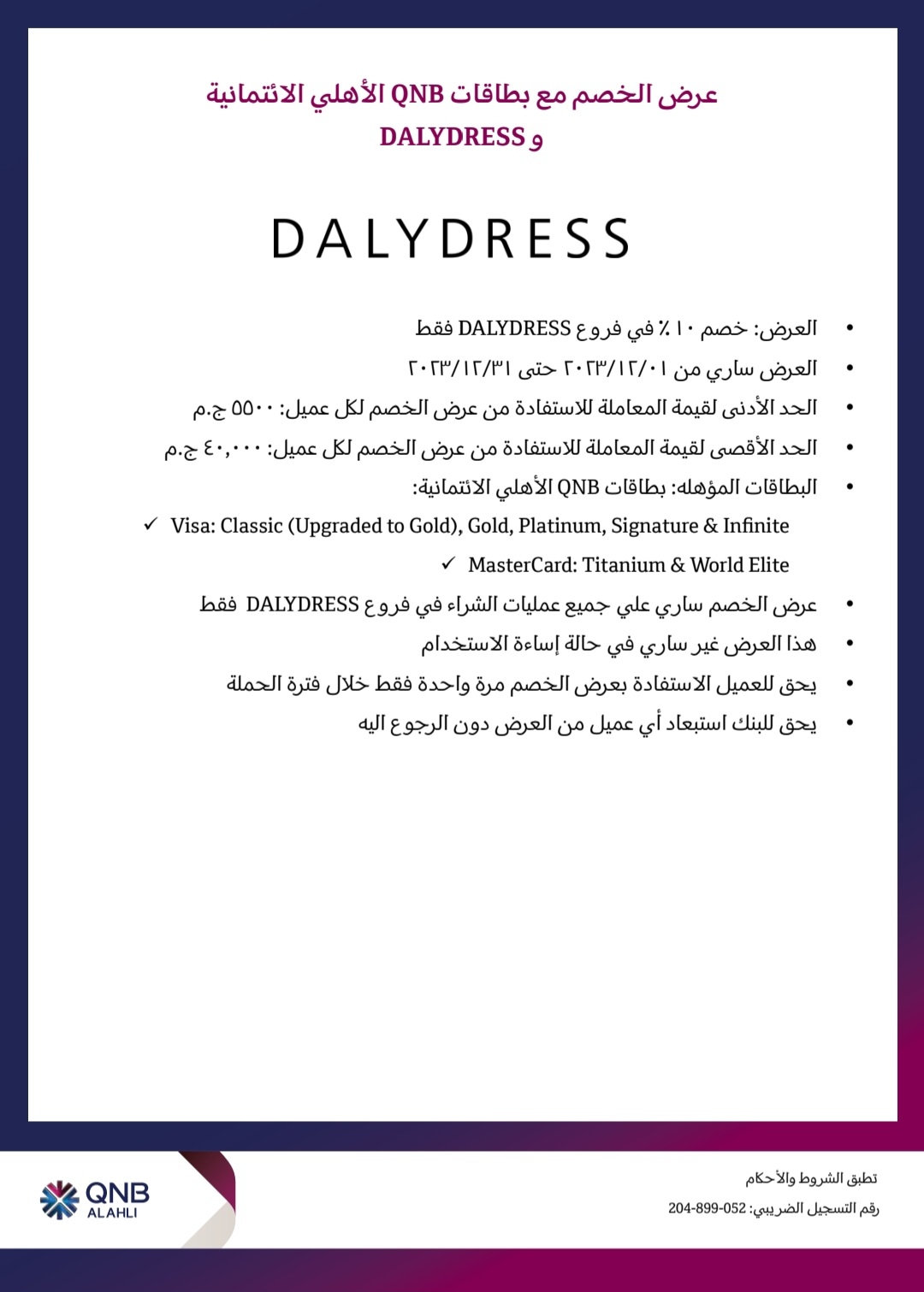 أعلن بنك QNB الأهلي لعملائه عن إتاحة خصم يصل إلى 10% عند شراء ملابسهم من فروع DALYDRESS و الدفع ببطاقات QNB الأهلي الائتمانية.