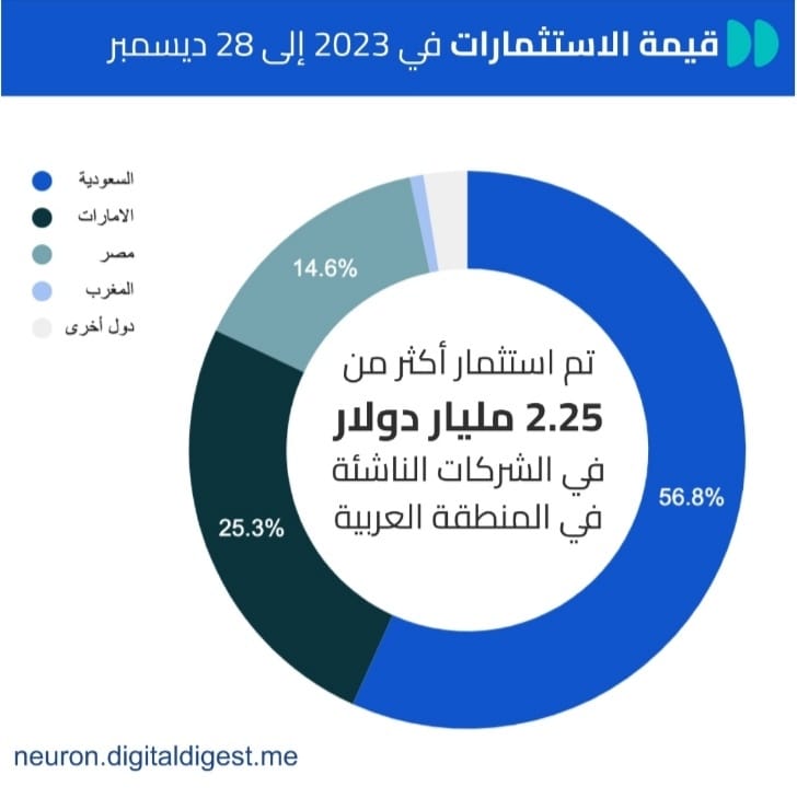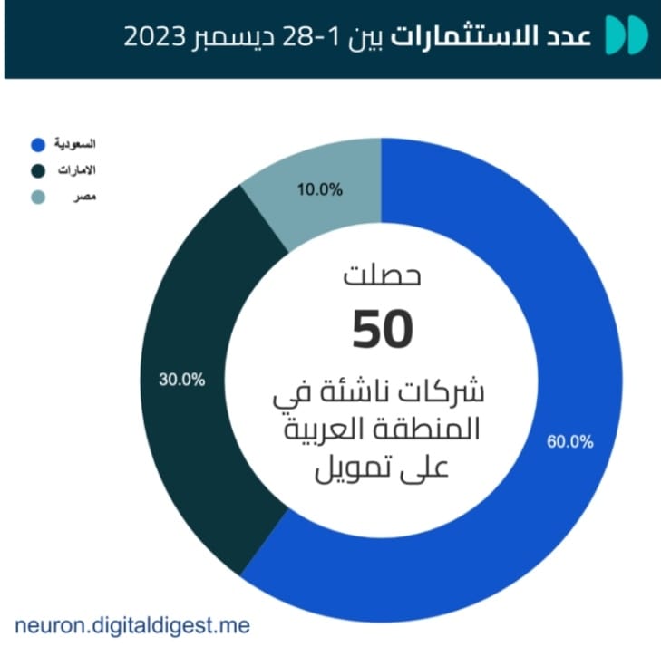 وحصلت 50 شركة ناشئة في المنطقة العربية على تمويل خلال شهر ديسمبر من عام 2023، كان 60% منها بالسعودية، مقابل 30% للشركات الإماراتية، فيما كان نصيب الشركات المصرية 10% من عدد الصفقات.