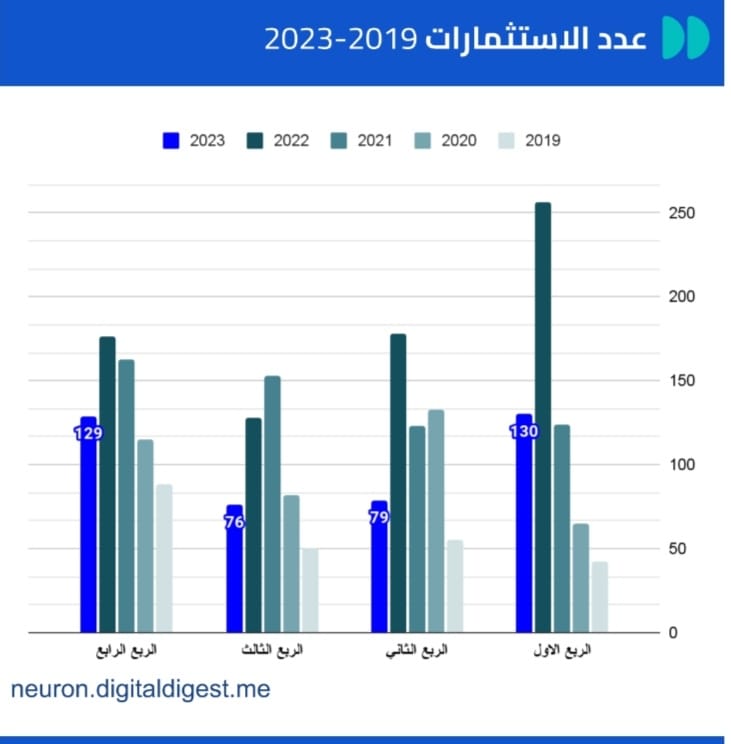 وتوزع عدد الاستثمارات بواقع 130 صفقة في الربع الأول من 2023، و79 صفقة في الربع الثاني، و76 صفقة بالربع الثالث، و129 استثمار بالربع الرابع.