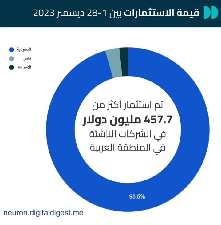 وخلال شهر ديسمبر، كشفت منصة Digital Digest، عن استثمار 457.7 مليون دولار في الشركات الناشئة بالمنطقة العربية، حيث سيطرت الشركات السعودية على قيمة الاستثمارات بنسبة 95.5%.