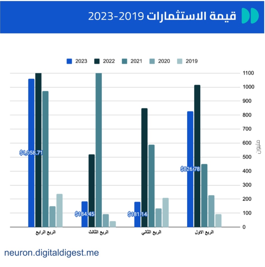 وأظهرت بيانات Digital Digest، أنه تم استثمار 1.06 مليار دولار في الشركات الناشئة بالمنطقة العربية خلال الربع الرابع من عام 2023م، وهو أعلى مستوى خلال العام ذاته؛ حيث سجل الربع الثالث استثمارات بقيمة 184.45 مليون دولار، مقابل 181.14 مليون دولار في الربع الثاني، ومقابل 826.78 مليون دولار في الربع الأول،وذلك وفق ما نشره موقع مباشر