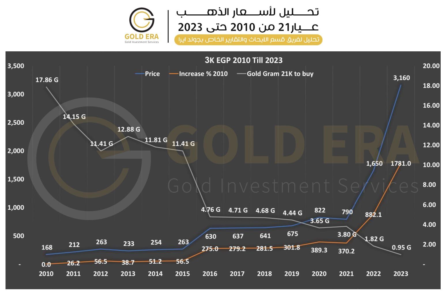 قال أسامة زرعي، المدير الإقليمي لشركة جولد إيرا في مصر، إن سعر جرام الذهب عيار 21 افتتح تعاملات عام 2010 عند مستوى 168 جنيهًا، واختتم تعاملات عام 2023 عند مستوى 3160 جنيهًا، بنسبة ارتفاع بلغت 1781 %.