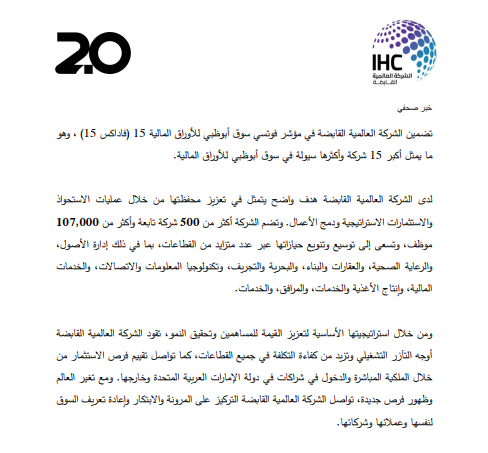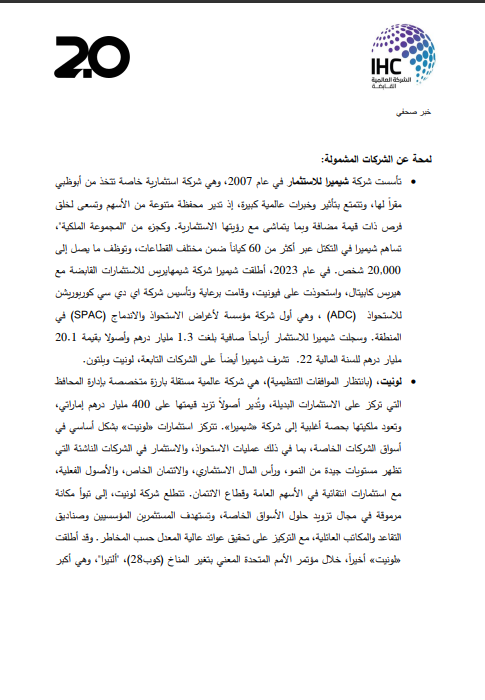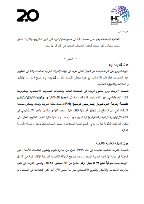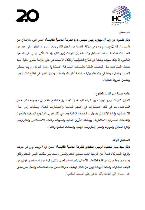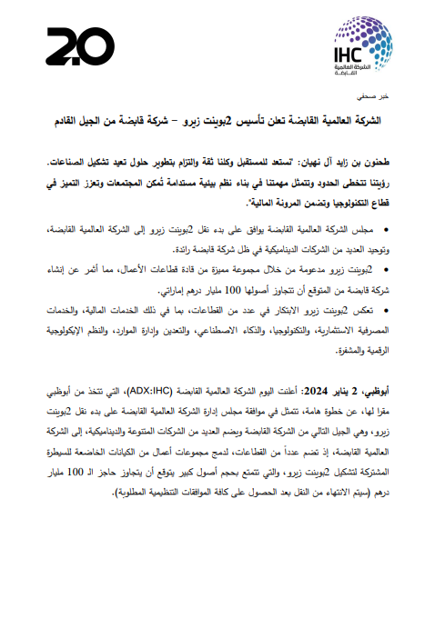 أعلنت الشركة العالمية القابضة «IHC» ومقرها أبوظبي عن تأسيس شركة «2 بوينت زيرو 2.0» لتكون الجيل التالي من الشركة القابضة، بهدف دمج مجموعات أعمال من الكيانات الخاضعة للسيطرة المشتركة تحت الكيان الجديد، بحجم أصول قد يتجاوز حاجز الـ 100 مليار درهم (27.2 دولار)>
